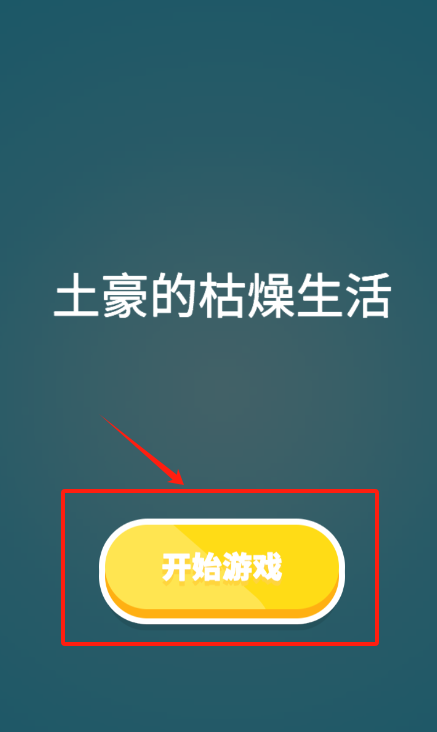 1、看到绿色背景黄色按钮上写着开始游戏,用手指点这个红框里的按钮就能进入土豪生活游戏啦。