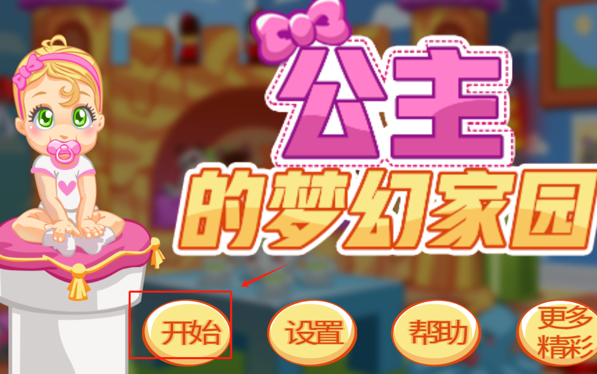 1、看到红色框框住的开始按钮,用手指点它,就能进入公主梦幻的家园游戏开始玩耍啦。