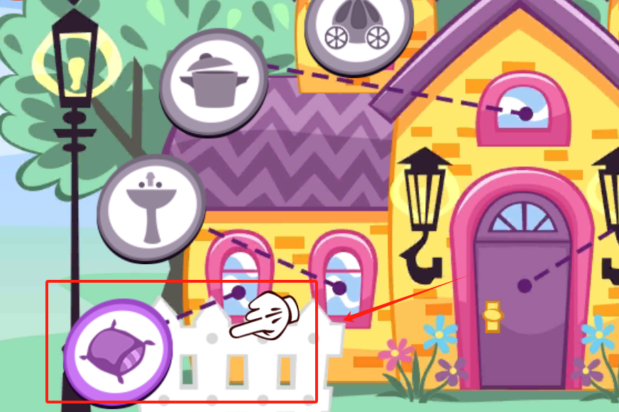 2、看到紫色枕头图标被红框圈起来,手指点这个枕头,就能选择装扮物品开始布置房间啦。