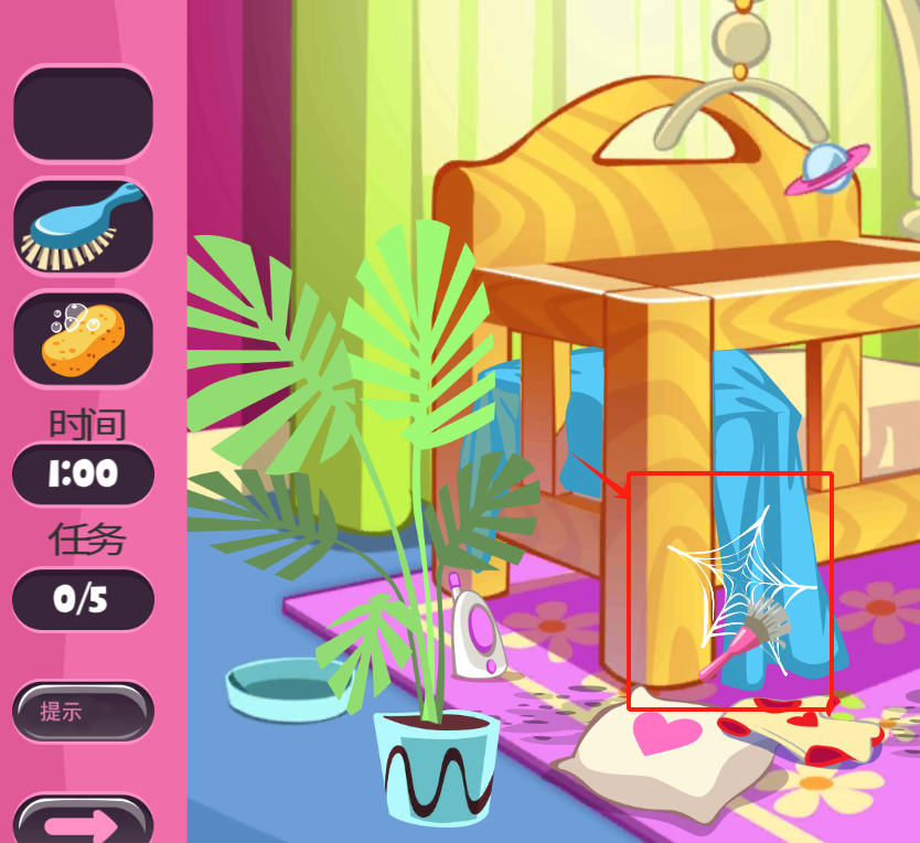 3、看到任务栏显示1分钟0/5,赶紧在倒计时结束前完成任务,点屏幕找东西收拾房间吧。