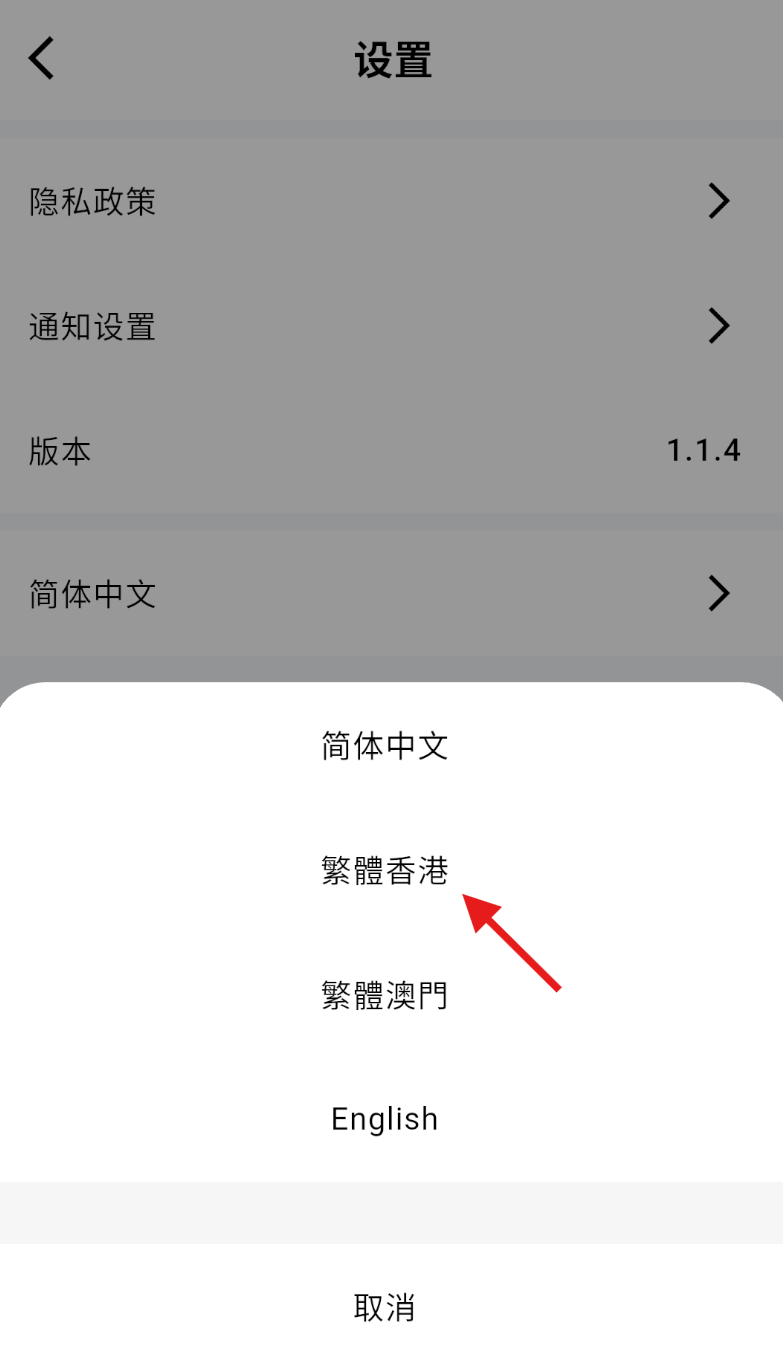 4、在弹出的语言选择中,点击 “繁體香港” 选项,即可完成软件语言到繁体中文的切换。