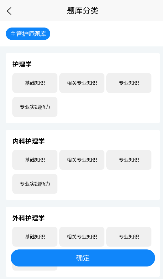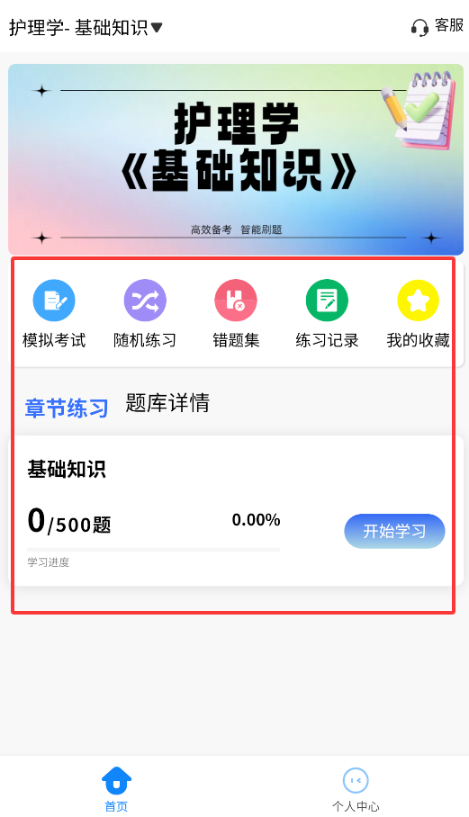 1、打开应用后,在题库中心选择护理学基础、内科护理等专业分类进行针对性学习。