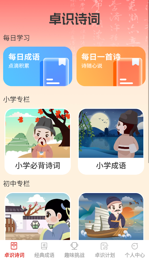 1、打开应用后,在首页体验"每日学习"功能,包含成语解析、诗词鉴赏及中小学分级学习内容。