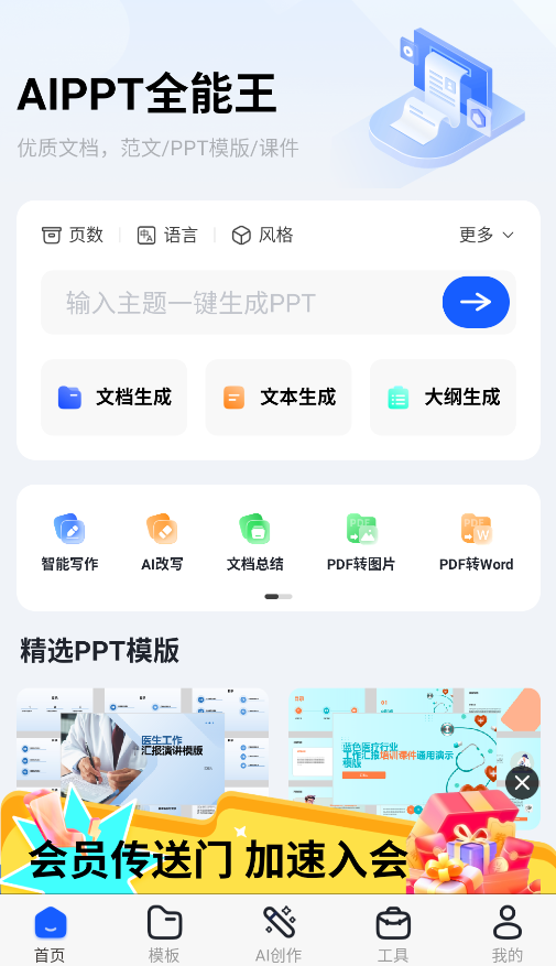 AIPPT全能王这个做PPT的APP挺省事的,只要输入几个关键词就能自动生成PPT,不用自己一页页排版。里面模板也多,各种风格的都有,直接套用特别方便。还能把做好的文件转成不同格式,手机上就能搞定。经常要做演示的朋友可以试试,比电脑上做省时间多了。