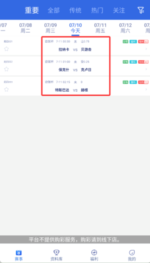 3、浏览赛事列表,根据时间、联赛等条件筛选感兴趣的场次。