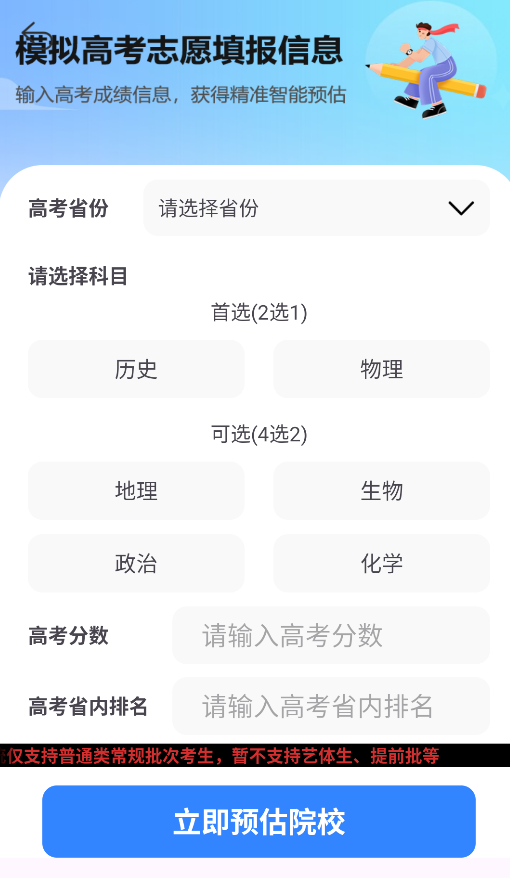 2、准确输入所在省份、考试科目、高考成绩及省内排名等关键信息,确保数据真实有效。