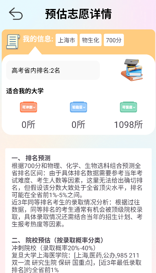 3、系统将基于智能算法分析,自动生成匹配度高的院校推荐列表及录取概率预测。