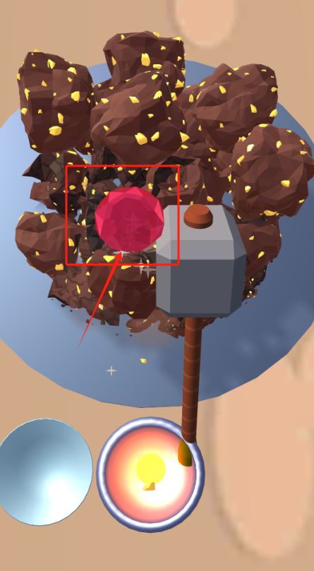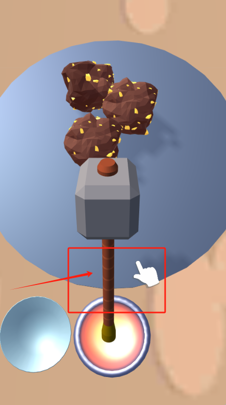 2、用红色框选中宝石,挥动锤子敲碎矿石堆,收集掉落的彩色碎片。