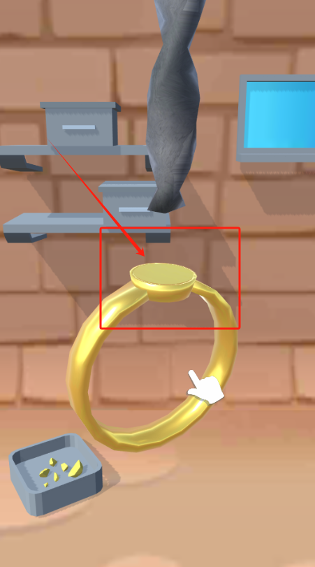 3、转动金戒指吸取盒子里的碎片,再放到灰色物件上合成新宝石。