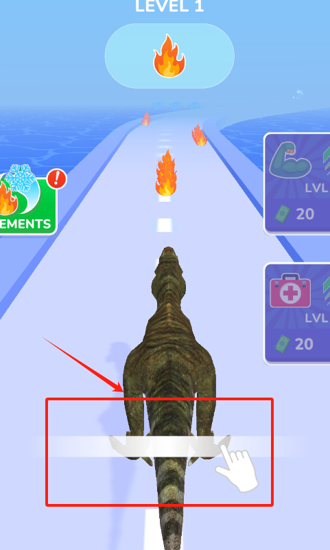 1、看到恐龙跑道上火焰和数字1,点下方闪烁道具图标,就能给恐龙加速冲过火焰障碍啦。