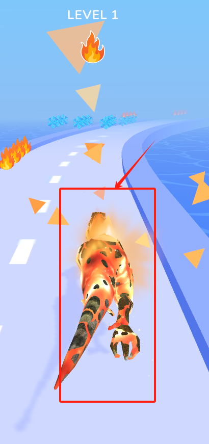 2、看到橙黑恐龙前方有火和三角障碍,点屏幕左右两侧控制方向,帮它躲开危险继续奔跑哟。