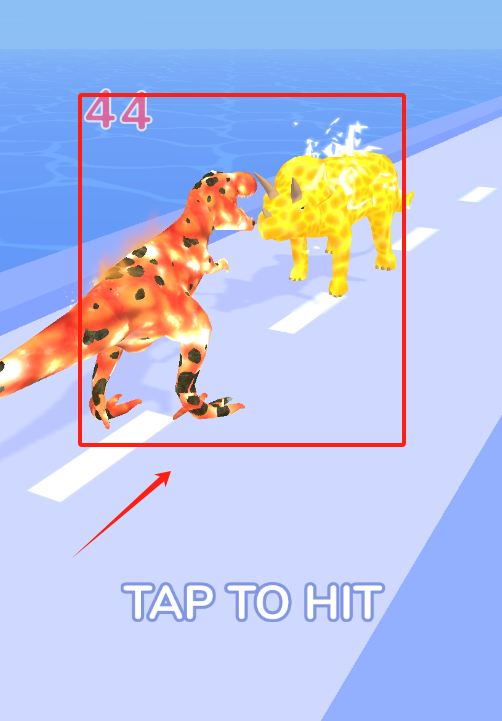 3、看到两只恐龙对峙和数字44,点黄色犀牛或提示区域,就能发动攻击击败对手得分啦。