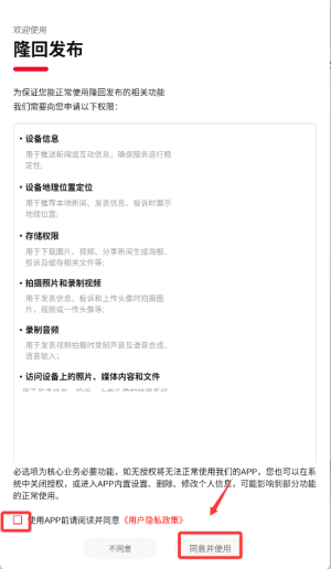 1、初次使用隆回发布APP时,系统会弹出用户协议页面,需要点击同意按钮才能继续操作。