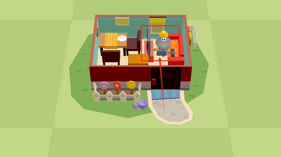 2、点击红色小屋可以进入室内,看到戴黄帽的小人坐在沙发上休息。