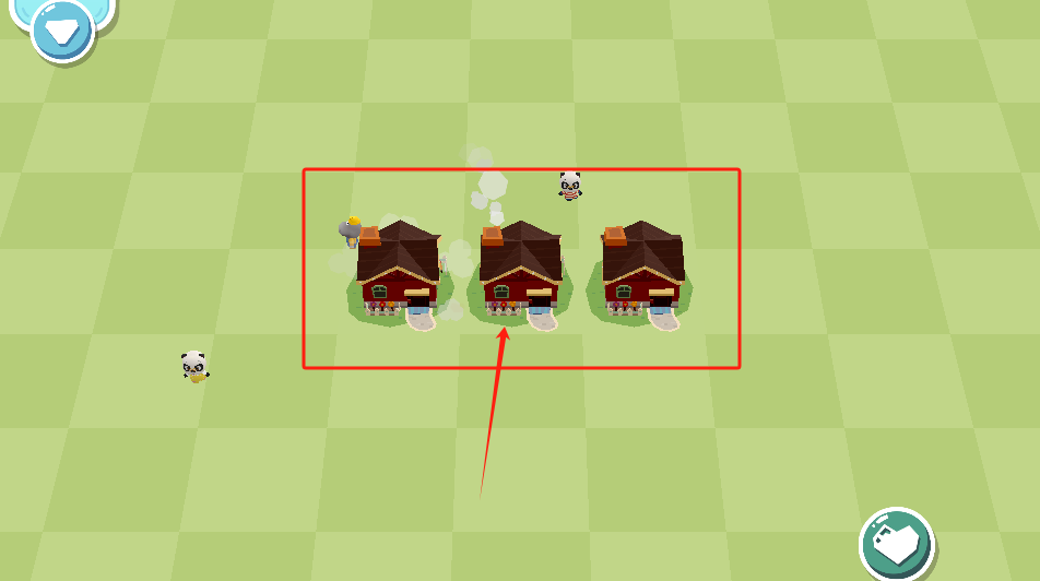 3、选中红框里的三间冒烟房子,可以升级或拆除,周围有小动物在活动。