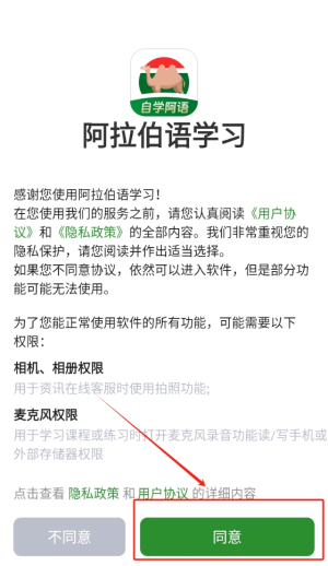 1、点击同意并进入应用,完成注册或登录,便于获取个性化学习内容和推荐。