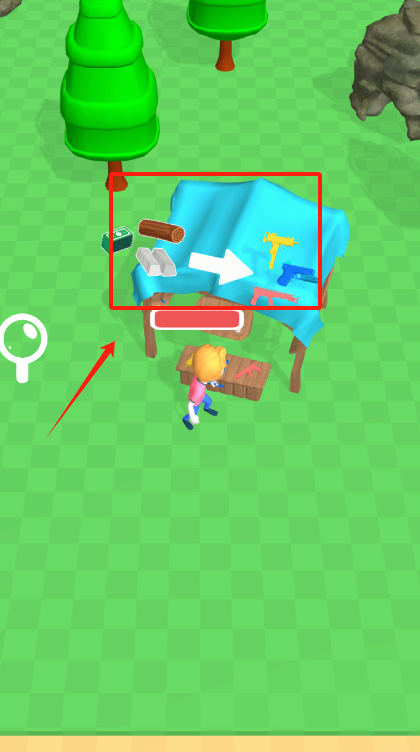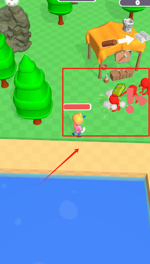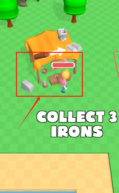 1、看到金发小孩和桌上石头,红框提示收集铁,点石头或周围木头找铁块,凑够三块就行。