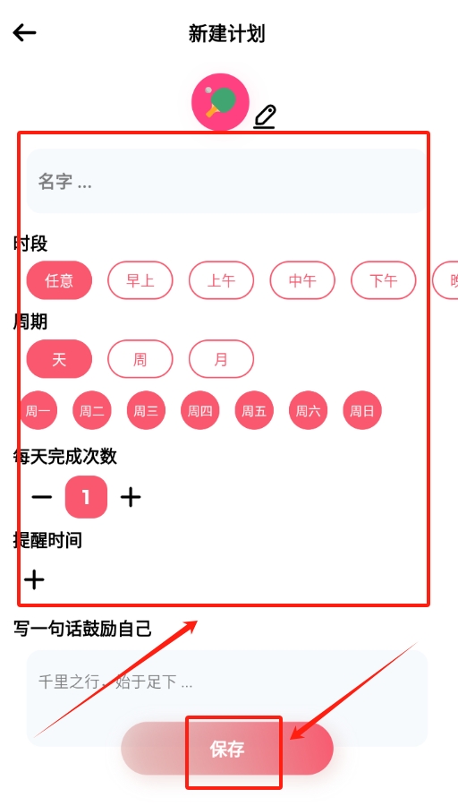 3、在创建计划的页面里,输入计划名字、设定时段、周期和每天完成次数,把这些信息填好后,点击保存按钮就行。