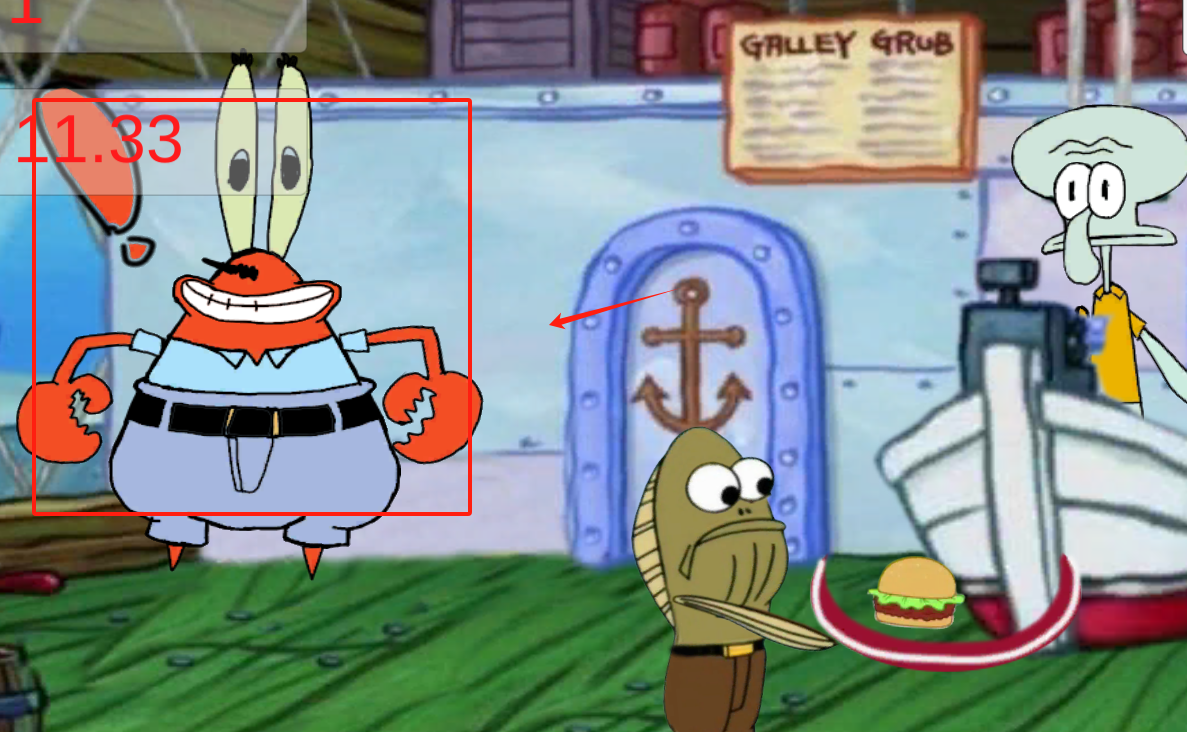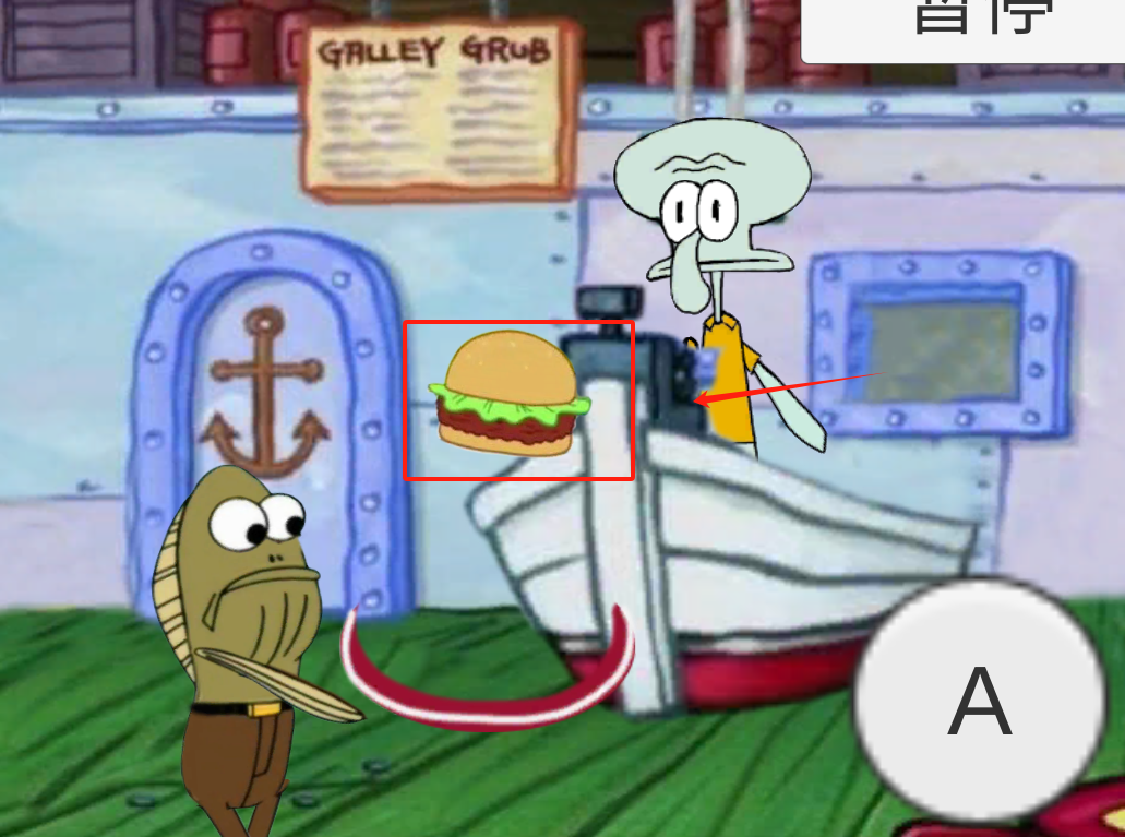 2、看到红色框圈出的汉堡和GALLEY GRUB招牌,用手指点这个汉堡图标,就能开始章鱼哥餐厅打工任务啦。