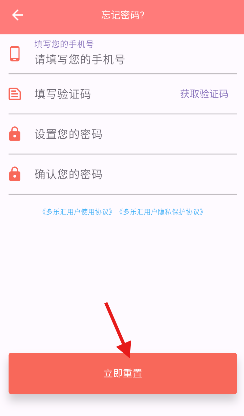 4、在该页面输入手机号及获取的验证码,连续两次输入新密码,确认无误后点击立即重置即可。