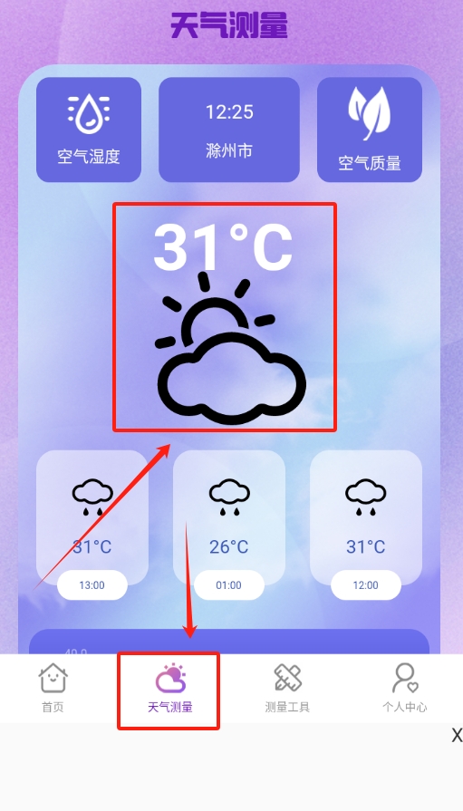 4、能查看空气湿度、空气质量,首页设一天中未来 24 小时的 3 个时间段,助于掌握温差,参考出行。