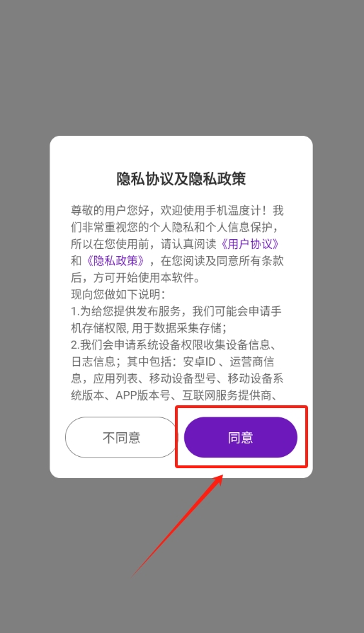 1、打开软件后,会出现软件协议的页面,点一下同意才能继续使用后面的功能,这一步不能跳过,不然用不了软件哦。