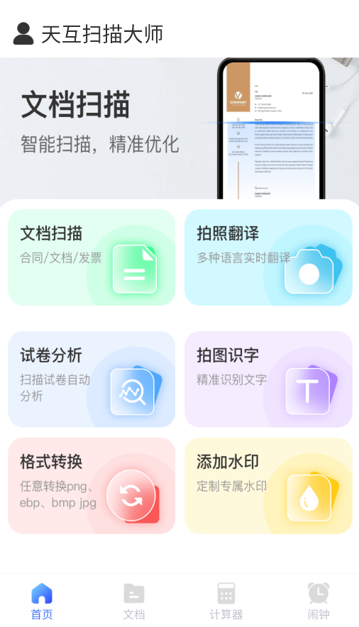 1、启动应用后,首页提供文档扫描、拍照翻译、试卷解析和图片文字识别等多项实用工具,满足多样化需求。
