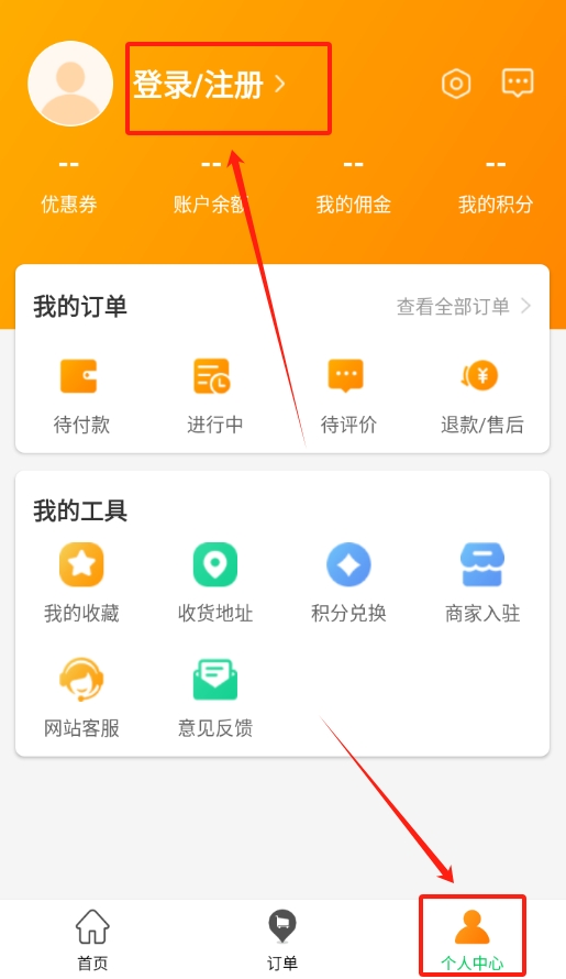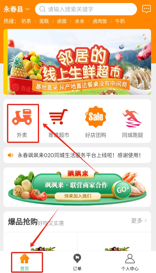 1、下载安装后打开,注册登录就能使用,首页有各种商品分类,想点外卖或买东西,直接点进对应分类。