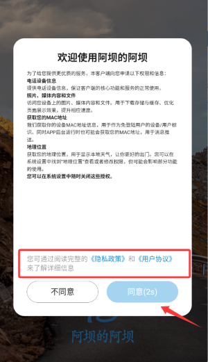 1、启动阿坝的阿坝APP后,首次使用需阅读并同意用户协议和隐私政策,点击确认进入主界面。