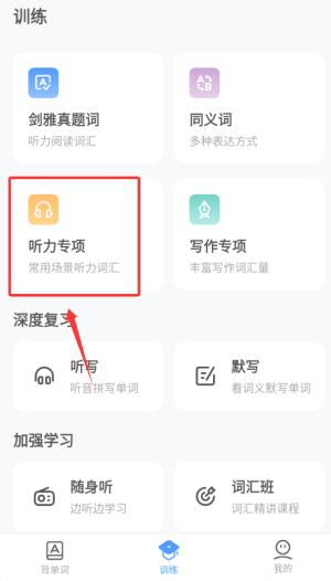 4、专项训练区提供不同难度的听力素材并支持变速播放功能。