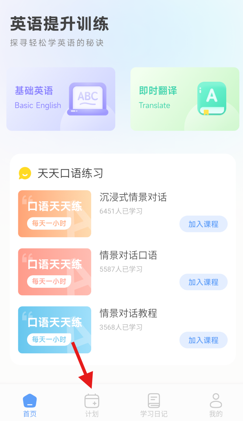 1、打开风信子口语软件,在导航栏中找到 “计划” 选项并点击,进入相关页面。