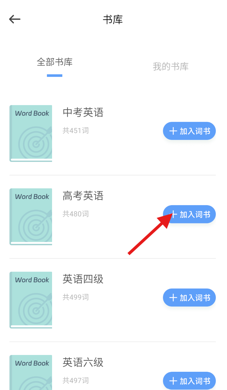 3、在书库中浏览并挑选想要学习的词书,找到后点击 “加入词书”,完成添加操作。