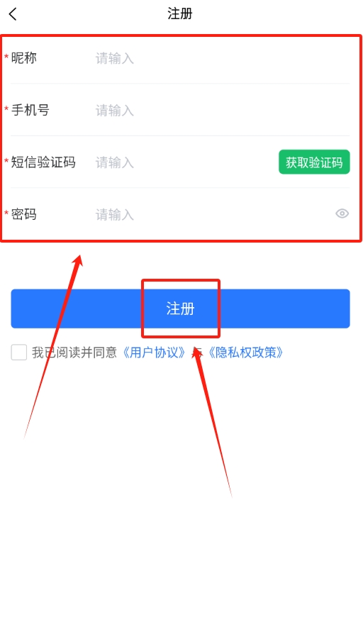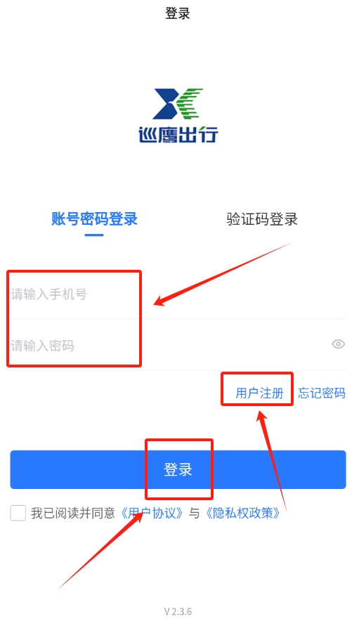 3、进入登录页面,在指定位置分别输入自己的手机号和设置的密码,填写完成后点击登录按钮。