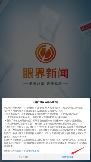 1、启动眼界新闻APP后,首次使用需阅读并同意用户协议和隐私政策,点击确认进入主界面。
