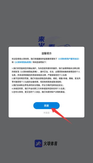 1、启动火球体育APP后,首次使用需阅读并同意用户协议和隐私政策,点击确认进入主界面。