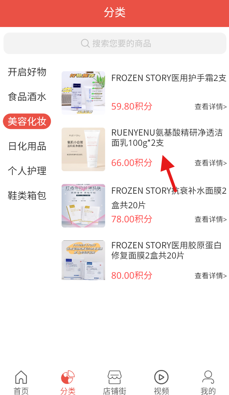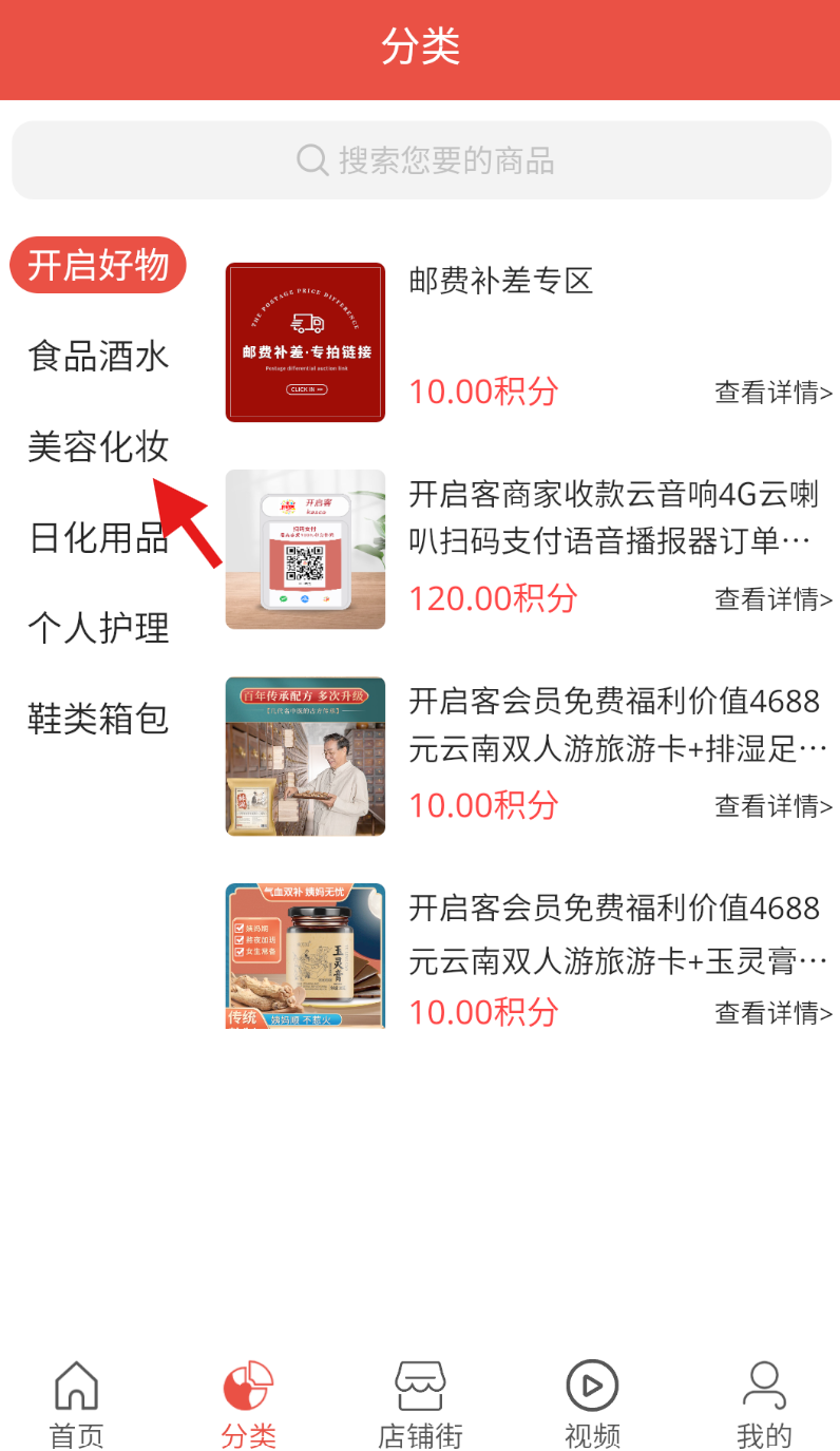2、在分类页面中,找到 “美容化妆” 这一类别并点击,即可看到相关的各类美容化妆产品。