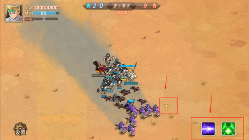 2、屏幕左侧控制角色移动方向,右侧为技能释放按钮,点击可发动主角技能对敌人造成范围打击或增强己方部队。