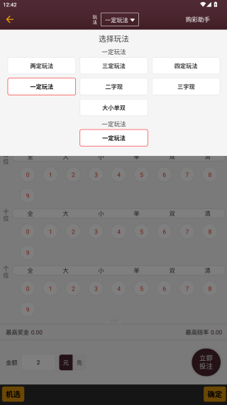 2、进入之后可以通过顶部的“玩法”按钮,来调整想要的七星彩玩法,点击选择即可;