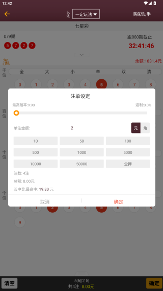 3、选中号码之后,点击确认即可看到详细的投注情况,还可以进行金额的调整;