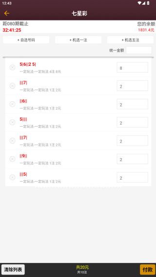 4、之后还能看到机选号码的选择,这个时候也还是可以对投注金额进行重新设定,点击数字方框即可,如果机选想要设置不同的投注金额,可以在“统计金额”上输入自己需要的金额;