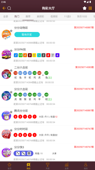 1、除了在平台上可以玩到七星彩、排列五等类型之外,还有很多其他的彩种可以体验,在购彩板块中,提供了热门的彩票推荐,比如分分动物彩、二分六合彩、腾讯分分彩登;