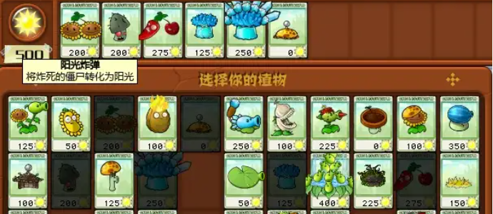 中期:由于此期间又要积累阳光、又要抵御僵尸导致植物的攻击无法第一时间消灭僵尸。这就让我们在开局选植物的时候要带上几个爆炸植物【阳光炸弹】【红眼菇】【樱桃辣椒】等,我已经帮他们放到顶部了。