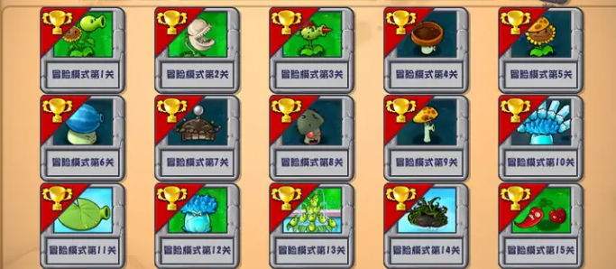 冒险模式:传统的闯关关卡,每一关都能解锁一个新的植物,会遇到新的僵尸哦。