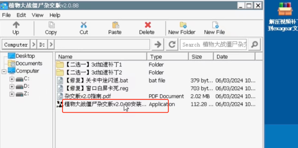 6、进入容器以后,在D盘找到植物大战僵尸杂交版,安装完毕以后就能开始游戏。