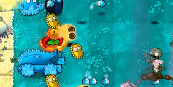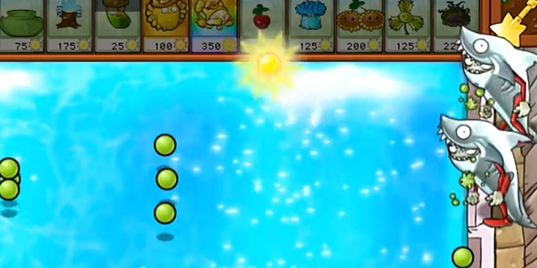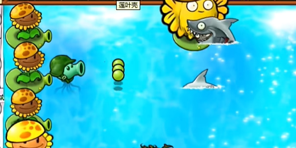 1、进入泳池关卡后,会遇到鲨鱼僵尸,只会出现在水池路径中。