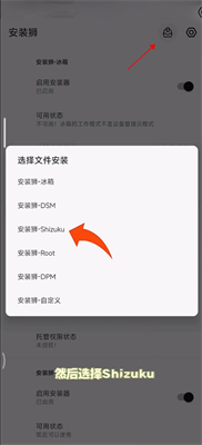 8、进入安装狮后点击右上角按钮并选择【安装狮-Shizukuv】。