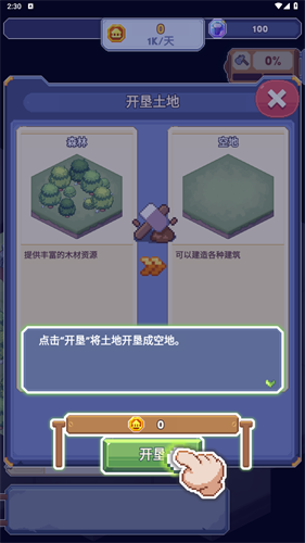 3、空地需要玩家通过开垦得到,将森林开垦为空地后即可进一步建造;