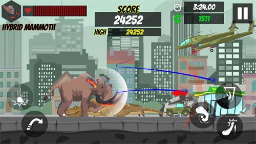 3、游戏以横版画面形式表现,通过点击按键控制不断前进的猛犸象发起不同攻击;