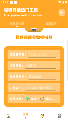 2、输入屏幕分辨率、机型名称、处理器等参数并选择模式。