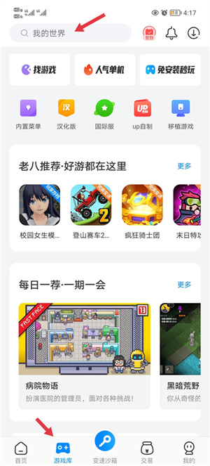 1、打开软件,直接进游戏库当中,可以在搜索框里输入想要玩的游戏名称。